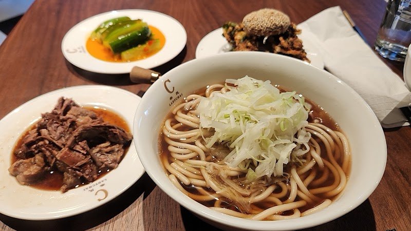 noodle broth lacked strong flavours. only reason there’s stars is the braised beef was good and soft. service? was ok. she was polite but she was busy wiping down tables with music in her ear to hear us. we came in 20 minutes after opening, the staff was still cleaning the tables that were visibly dirty from previous night. we asked for a baby chair and my mom had to thoroughly wipe it down as it was dirty and coated with oily substances. staff served table water and chopsticks but no soup spoons to enjoy the (mid) soup. did not provide any cutlery for the kid, had to ask for it which is fine but it goes without saying. would not come back!